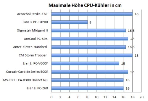 Mit einer maximalen Höhe von reichlich 18 cm sollte es mit handelsüblichen Tower-Kühlern zu keinen Problemen kommen. Sollten Lüfter im Seitenteil oberhalb des CPU-Sockels verbaut werden, verringert sich die maximale CPU-Kühlerhöhe natürlich um die Dicke der Lüfter.