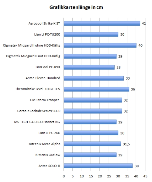 42 cm Platz für Grafikkarten bei verbautem Laufwerkskäfig sind natürlich eine Klasse für sich. Ein regulärer Midi-Tower wie Xigmateks Midgard II kann oft selbst mit entferntem Laufwerkskäfig nicht soviel Platz bieten.