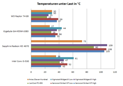 Besonders auffällig an den Messwerten ist, dass das Strike-X ST sich keineswegs an die Spitze des Testfelds setzen kann - und das, obwohl es das größte Innenvolumen aller einbezogenen Gehäuse und zugleich eine gute Lüfterausstattung bietet. Vor allem die relativ hohen Temperaturen von HDD und Erweiterungskarten sind auffällig. Für die HDD lässt sich vermuten, dass die Laufwerksschublade den Luftstrom des Frontlüfters abfängt. Der Luftstrom des Deckellüfters verfehlt die passiv gekühlte Grafikkarte - mit einer Montage des Lüfters oberhalb der Grafikkarte und gegebenenfalls zusätzlichen Lüftern im Seitenteil ließen sich die Kühlung der Grafikkarte aber leicht verbessern.
