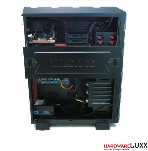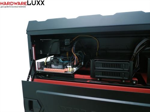 Obwohl das Deckel-Segment eigentlich viel Platz bietet, sitzen Mainboard und Netzteil knapp übereinander. Gut zu erkennen ist, dass der CPU-Kühler kaum höher als der genutzte kleine Boxed-Kühler sein darf. Da es in diesem Gehäuseteil keine Möglichkeiten für Kabelmanagement gibt, fällt es entsprechend schwer, Kabel sauber zu verlegen.