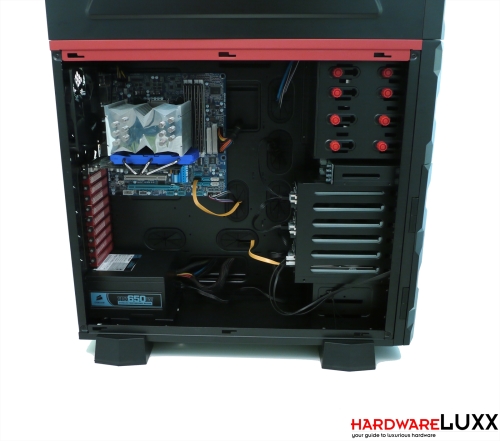 Wesentlich komfortabler geht es im unteren Bereich zu. Es gibt genug Raum, um auch sperrige Mainboards und Netzteile unterzubringen. Das vorhandene Kabelmanagement erfüllt seinen Zweck. Die Anschlusskabel für die Hot-Swap-Einschübe lassen sich allerdings nicht versteckt verlegen, weil die Laufwerksmontage natürlich nicht wie sonst üblich um 90 Grad gedreht erfolgt.