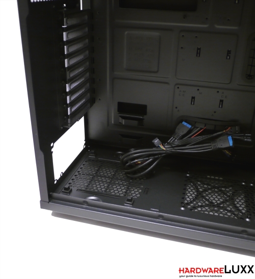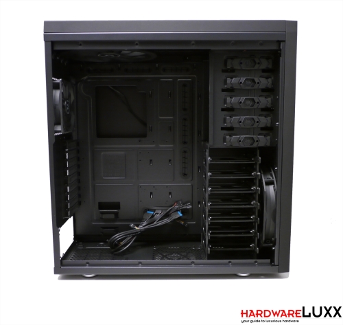 Der schwarz lackierte Innenraum des Shinobi XL bietet viel Platz. Damit kann zum einen ein XL-ATX-Mainboard verbaut werden, zum anderen lassen sich aber auch fünf optische Laufwerke und sieben Festplatten bzw. SSDs unterbringen (ein achtes 2,5-Zoll-Laufwerk kann im mitgelieferten Laufwerksadapter untergebracht werden). Der grundlegende Aufbau erinnert sehr an das E-ATX-Gehäuse BitFenix Colossus - allerdings bietet das Shinobi XL einen neunten Erweiterungskartenslots und ein modifiziertes Kühlsystem.