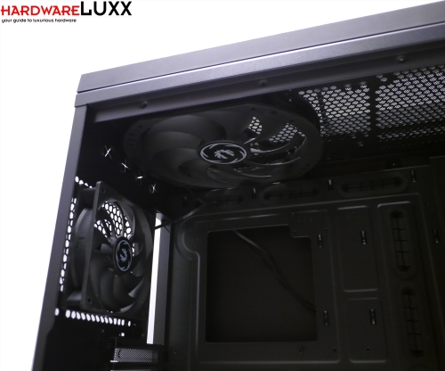 Der direkte Vergleich veranschlaulicht am besten den Größenunterschied zwischen dem rückseitigen 120-mm-Spectre-Lüfter und dem 230-mm-Modell im Deckel. Alle drei Lüfter werden per 3-Pin-Anschluss angebunden, Adapter auf Molex liegen nicht bei. Die Lüfter erzeugen bei 12 Volt ein hörbares, aber subjektiv nicht aufdringliches Luftrauschen.
