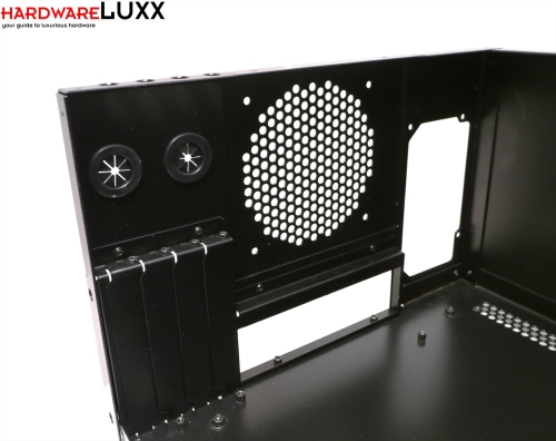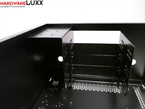 Links neben den vier 5,25-Zoll-Laufwerksplätzen können bis zu drei 3,5-Zoll-Festplatten hochkant montiert werden. Für beide Laufwerkstypen wird die klassische Schraubmontage genutzt. Die Festplatten werden nicht entkoppelt - unsere WD Raptor quittierte das mit sehr prägnanten Zugriffsgeräuschen. Montageplätze für 2,5-Zoll-Laufwerke fehlen völllig.