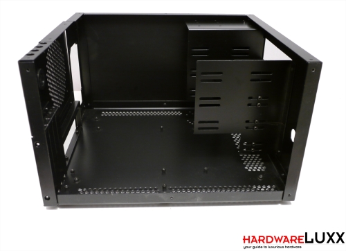 Durch Klick auf das Bild gelangt man zu einer vergrößerten AnsichtEinige (entfernbare) Bleche dienen als Laufwerkshalterung, ansonsten ist das Gehäuseinnere unverbaut.