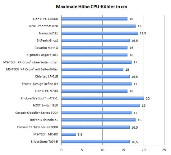 Eine maximale CPU-Kühlerhöhe von etwa 16 cm ist für hohe Tower-Kühler knapp bemessen. Unser Scythe Yasya ist z.B. 159 mm hoch. Allerdings gilt dieser Wert nur, wenn die Trennwand im Gehäuse montiert ist. Ansonsten steht deutlich mehr Platz zur Verfügung. Werden die 16 cm überschritten, muss der Tower-Kühler aber im Gehäuse montiert werden - er kollidiert sonst beim Hereinschieben des Mainboard-Trays mit der Rückwand.