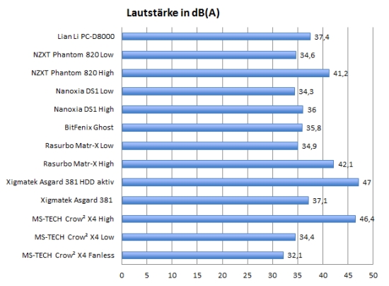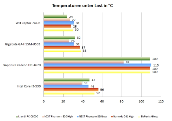 Aufgrund dieser exemplarischen Bestückung mit zwei Lüftern sind die Messergebnisse nur bedingt aussagekräftig. Deutlich wird zumindest, dass die seitliche Kühlung der Festplatten eine sinnvolle Lösung ist. So sollten sich auch üppigere HDD-Bestückungen gut kühlen lassen. Die Temperaturen von Mainboard und Prozessor sind unauffällig. Da die passiv gekühlte Grafikkarte sich nicht im Luftstrom eines Gehäuselüfters befindet, wird sie relativ heiß. Da die Trennwand die Möglichkeit bietet, Lüfter auf Höhe der Erweiterungskarten zu montieren, könnte aber schnell für Abhilfe gesorgt werden.
