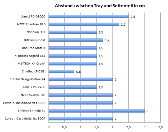 Der Abstand zwischen Tray und Seitenteil ist mit 2,5 cm eigentlich angenehm groß. Allerdings wird der Abstand durch hervorstehende Streben an einigen Stellen reduziert. In Kombination mit der geringen Zahl an Kabeldurchführungen sorgt das dafür, dass Kabelmanagement nur eingeschränkt umgesetzt werden kann.