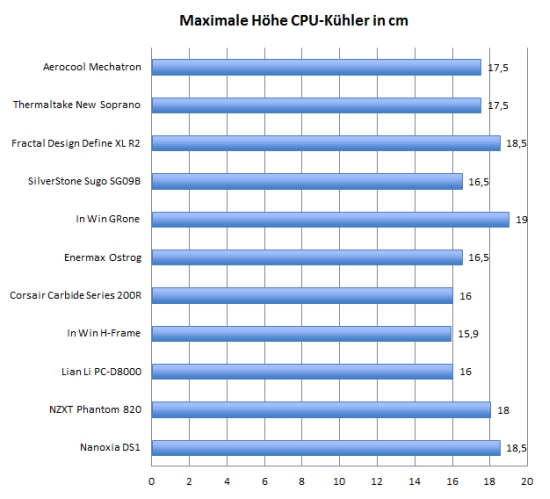 Eine maximale CPU-Kühlerhöhe von etwa 17,5 cm reicht für handelsübliche Tower-Kühler aus.