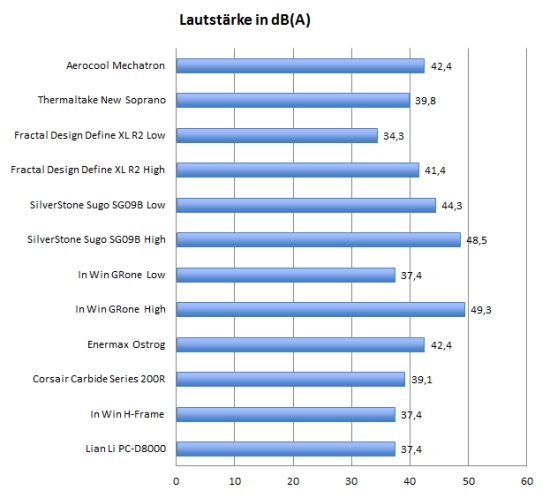 Auch bei der Lautstärke bietet sich der Vergleich zum New Soprano an. Wegen der offenen Front und der etwas höheren Lüfterdrehzahl wird das Mechatron etwas lauter. Für ein Gamer-Gehäuse ist die Lautstärke aber durchaus noch akzeptabel.