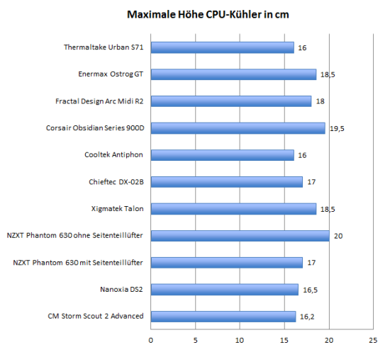 Obwohl das Thermaltakegehäuse ein Full-Tower ist, können nur Prozessorkühler mit maximal 16 cm Höhe verbaut werden. Der 15,9 cm hohe Scythe Yasya unseres Testsystems passt zwar noch in das Urban S71, einige aktuelle Towerkühler lassen sich aber nicht im Gehäuse nutzen.