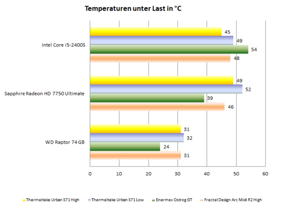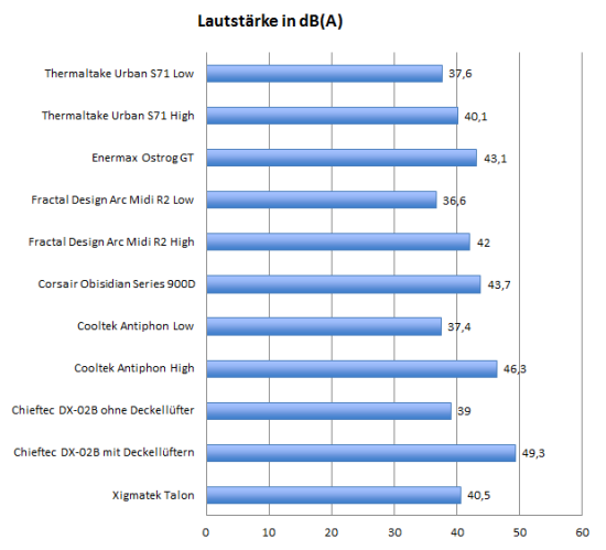 Bei den Lautstärkemessungen wird das Urban S71 allerdings etwas von unserer frontalen Messposition begünstigt. Die Frontplatte dämpft die Geräusche des Frontlüfters. Der Schall von Deckel- und Rückwandlüfter kann hingegen ungehindert austreten, er wird von unserem Messgerät aber nur eingeschränkt wahrgenommen. In Abhängigkeit von der Position des Gehäuses zum Nutzer kann das Urban S71 subjektiv etwas lauter sein, als es die Messungen vermuten lassen.