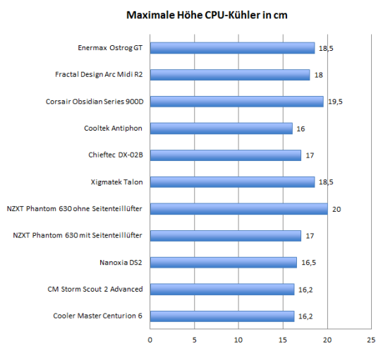 Gegenüber dem einfachen Ostrog hat das Ostrog GT vor allem in der Breite zugelegt. Das wirkt sich positiv auf die Kompatibilität zu hohen Prozessorkühlern aus. Selbst 18,5 cm hohe Riesenkühler lassen sich im Enermaxgehäuse noch verbauen.
