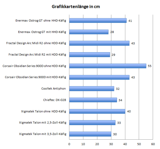 28 cm reichen für manche überlange Grafikkarte wie die Radeon HD 5970 nicht aus. Dank des modularen HDD-Käfigs man aber leicht noch mehr Raum schaffen. Mit 41 cm lassen sich dann auch extrem lange Erweiterungskarten problemlos unterbringen.
