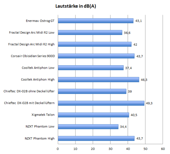 Die gute Kühlleistung hat aber auch ihren Preis: Die Lüfter des Ostrog GT sind zwar nicht extrem laut, aber sehr deutlich zu hören. Für Silentnutzer ist das Gehäuse mit ungeregelten Lüftern definitiv nicht geeignet.