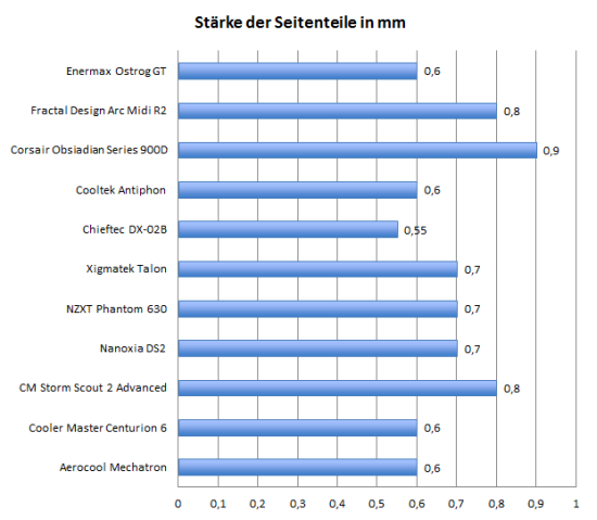 Wir messen die maximale Höhe des Prozessorkühlers, die maximale Grafikkartenlänge und den Abstand zwischen Tray und Seitenteil mithilfe eines handelsüblichen Zollstocks. Für die Messung der Materialstärke messen wir mit einer Mikrometerschraube die Dicke des Seitenteils. Ergänzend berücksichtigen wir vorhandene Hersteller- bzw. Händlerangaben. Trotzdem können wir Messungenauigkeiten nicht ausschließen. Die Werte können zwar als Orientierung dienen, sind speziell bei den ersten drei Messungen aber nicht mm-genau.