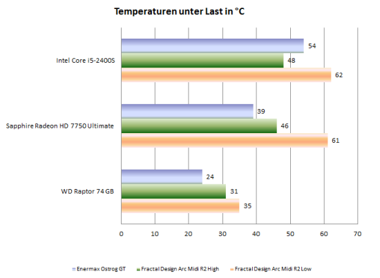 Enermax vertraut für die Kühlung des Ostrog GT auf zwei 140-mm-Frontlüfter und einen 120-mm-Lüfter an der Rückwand. Die Kühlleistung ist durchaus ordentlich. Im Vergleich zu Fractal Designs Arc Midi R2 fallen die niedrigeren Temperaturen der Grafikkarte und der Festplatte auf. Die beiden Frontlüfter können dank der offenen Front hier ihre Stärke ausspielen. Nur der Prozessor wird im Arc Midi R2 etwas besser gekühlt. Das erklärt sich mit dem größeren 140-mm-Rückwandlüfter und dem vormontierten 140-mm-Deckellüfter dieses Gehäuses. Insgesamt kann das Enermaxgehäuse mit guten Temperaturen punkten, die Kühlleistung überzeugt.