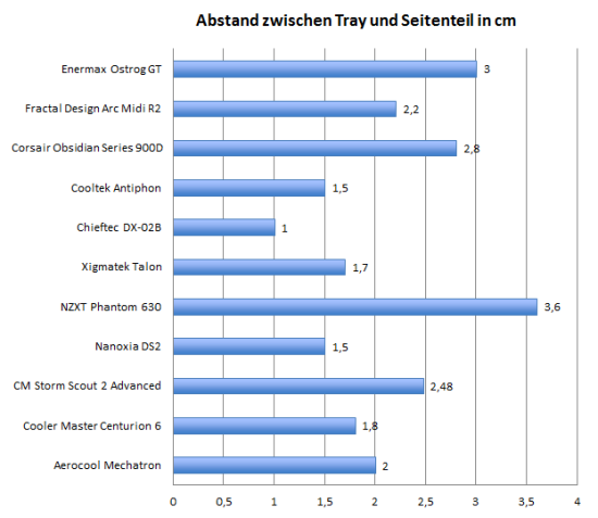 Die Gehäusebreite wirkt sich nicht nur positiv auf die maximale CPU-Kühlerhöhe aus. Auch der Platz hinter dem Tray ist üppig. Regulär wären 2 cm Abstand zwischen Tray und Seitenteil. Weil eine große Fläche des Seitenteils herausgewölbt ist, steigt der Abstand sogar auf 3 cm.