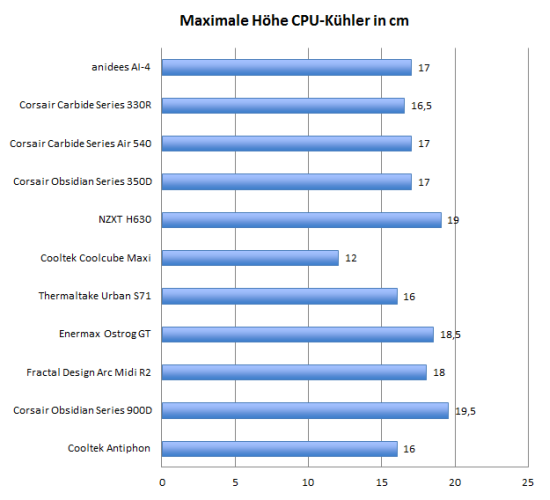 Obwohl das AI-4 nur 18,6 cm breit ist, bietet es etwa 17 cm Platz für den Prozessorkühler. Damit können selbst die meisten Towerkühler genutzt werden. anidees macht das möglich, indem auf ein typisches Kabelmanagement verzichtet wird und das rechte Seitenteil nur wenige Millimeter hinter dem Mainboardtray sitzt.