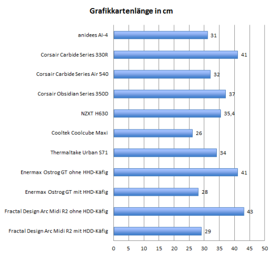 Verzichtet man auf die Festplattenhalterung, können Grafikkarten mit bis zu 31 cm Länge verbaut werden. Damit können auch viele überlange High-End-Grafikkarten im Mini-Tower genutzt werden. Nur bei wenigen Modellen wie der Radeon HD 5970 (etwa 31 cm lang) wird es eng.