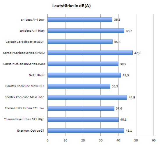 Obwohl der Wechsel zwischen den beiden Settings der Lüftersteuerung bei unserem Testaufbau keinen relevanten Temperaturunterschied bewirkte, blieben Auswirkungen auf die Lautstärke nicht aus. Mit heruntergerelten Lüftern ist das gedämmte anidees AI-4 angenehm leise - die Lautstärke bewegt sich etwa auf dem Level des Carbide Series 330R, eines Silentgehäuses von Corsair. Manche Silentgehäuse wie das Fractal Design Define R4 oder die Deep Silence-Modelle von Nanoxia sind aber noch etwas leiser. Werden die Lüfter hochgeregelt, werden sie sehr deutlich hörbar.