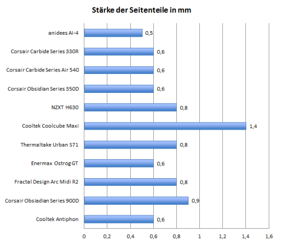 Die Seitenteile des anidees-Gehäuses sind nur rund 0,5 mm dick. Angesichts des doch nicht ganz günstigen Verkaufspreises wäre eine höhere Materialstärke auch bei einem Micro-ATX-Gehäuse wünschenswert.