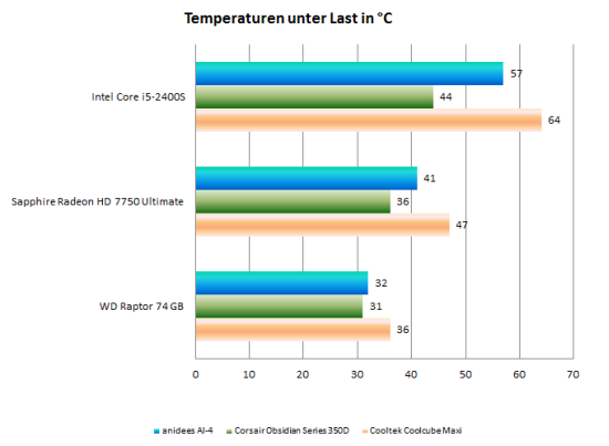 Das anidees AI-4 ist gerade in der von uns getesteten, gedämmten Variante klar als Silentgehäuse ausgerichtet. Da überrascht es nicht, dass die Temperaturen etwas höher ausfallen als beispielsweise im Obsidian Series 350D, einem Micro-ATX-Gehäuse von Corsair für Enthusiasten. Die Komponenten bleiben aber immer noch deutlich kühler als im Cooltek Coolcube Maxi, einem HTPC-Gehäuse für Micro-ATX-Mainboards, das ohne Lüfter ausgeliefert wird. Insgesamt ist die Kühlleistung für genügsame Systeme völlig ausreichend. Hitzige High-End-Hardware könnte das Kühlkonzept aber an seine Grenzen treiben - und dann gibt es keine Möglichkeit, weitere Gehäuselüfter nachzurüsten.