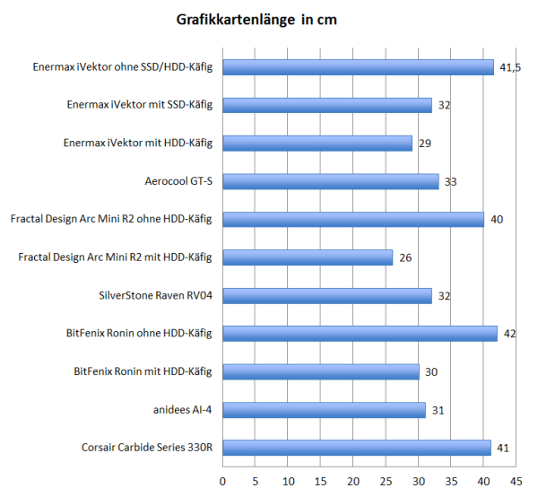Dank des modularen HDD/SSD-Käfigs ist das Gehäuse auch für lange Erweiterungskarten geeignet. Wird der Käfig als 3,5-Zoll-Käfig genutzt, sind zwar nur 29 cm verfügbar. Doch der Umbau des Käfigs sorgt schnell für mehr Platz. Schon bei der Nutzung als SSD-Käfig können aber selbst 32 cm lange Erweiterungskarten genutzt werden. Nach dem Entfernen der Seitenwand stehen sogar über 41 cm zur Verfügung.