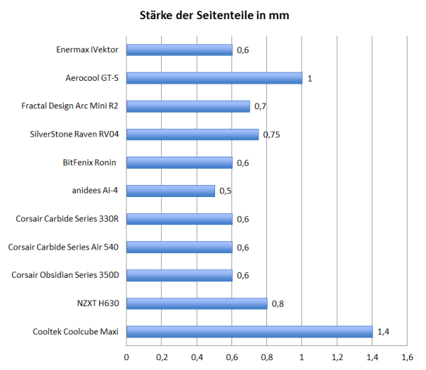 Nicht ganz so überzeugend ist hingegen die Materialstärke. Die Seitenteile sind 0,6 mm und ihre Verwindungssteifigkeit lässt etwas zu wünschen übrig. Dass die Materialstärke auch an anderer Stelle nicht besonders hoch ausfällt, deutet sich schon am geringen Gewicht des Gehäuses an.
