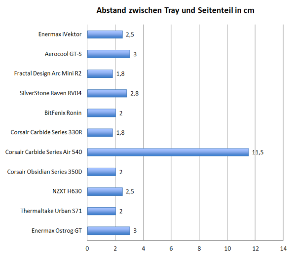 Die gewölbten Seitenteile wirken sich auch positiv auf das Kabelmanagement aus. Wir messen immerhin rund 2,5 cm Abstand zwischen Tray und Seitenteil.