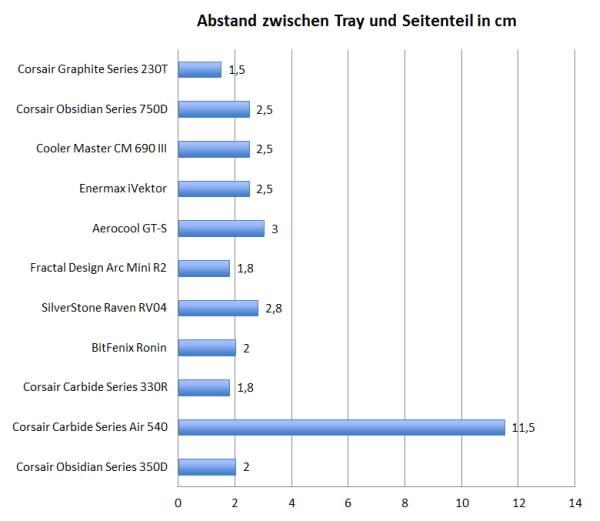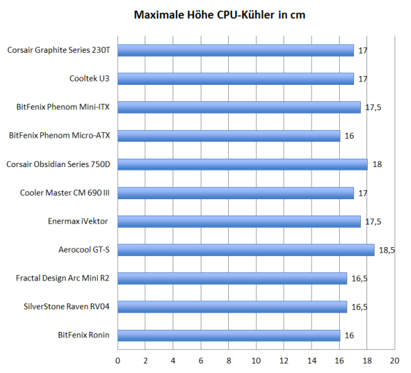 Bei günstigen Gehäusen geizen die Hersteller oft mit der Gehäusebreite, hohe Towerkühler können dann nicht genutzt werden. Dass Graphite Series 230T nimmt aber immerhin bis zu 17 cm hohe Kühler auf und kann deshalb mit den meisten handelsüblichen Kühlern genutzt werden.