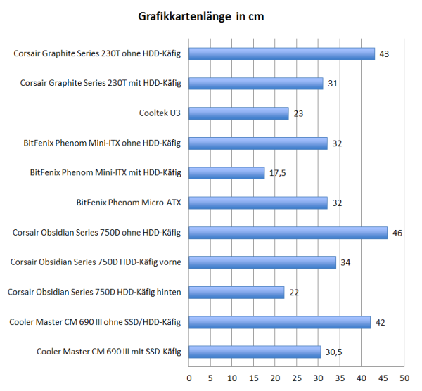 Der Laufwerkskäfig des Midi-Towers ist zwar nicht modular, trotzdem gibt es zwei relevante Messwerte für die maximale Grafikkartenlänge. Die oberen Erweiterungskartenslots liegen oberhalb des HDD-Käfigs. Deshalb ist dort mehr als genug Platz, selbst für überlange High-End-Grafikkarten. Bei der Nutzung eines ATX-Mainboards wird die Grafikkartenlänge in den unteren Erweiterungskartenslots dann aber doch von diesem Käfig limitiert. Eine Grafikkartenlänge von 31 cm sollte dann nicht überschritten werden.