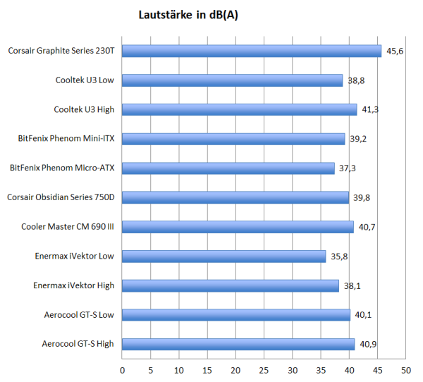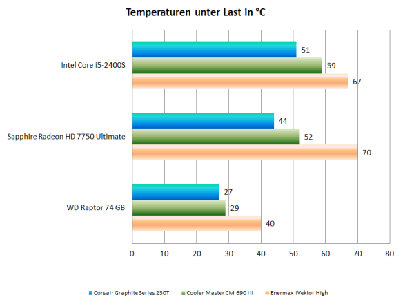 Das Kühlkonzept des Graphite Series 230T mit den beiden 120-mm-Frontlüftern und dem 120-mm-Rückwandlüfter ist zwar alles andere als außergewöhnlich, die Kühlleistung aber trotzdem beachtlich. Dass die Temperaturen niedriger als im Enermax iVektor ausfallen, kann nicht überraschen. Dieses vergleichbare Gehäuse wird nur mit einem einzigen 120-mm-Lüfter ausgeliefert. Erstaunlicher ist auf den ersten Blick, dass sich das Corsairmodell auch deutlich vor das CM 690 III von Cooler Master setzt. Dieses Gehäuse hat immerhin zusätzlich zum rückwandigen 120-mm-Lüfter einen großformatigen 200-mm-Frontlüfter.