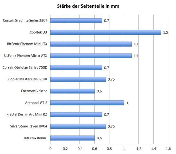 Für ein Gehäuse der unter 100-Euro-Preisklasse ist eine Materialstärke von 0,7 mm nicht untypisch. Die Seitenteile sind bei dieser Materialstärke zumindest ausreichend robust.