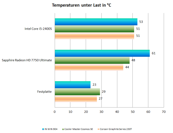 Angesichts des schwach dimensionierten Kühlsystems können vom IN WIN 904 keine besonders niedrigen Temperaturen erwartet werden. Tatsächlich zeigen die Messwerte, dass genügsame Hardware im Gehäuse zumindest ausreichend gekühlt werden kann. Wer abwärmeintensive Hardware verbaut, sollte sich der Einschränkungen des Kühlsystems aber bewusst sein. Das IN WIN-Gehäuse lässt dann nur wenig Spielraum für eine Steigerung der Kühlleistung - beispielsweise durch Nutzung einer Komplettwasserkühlung mit Singleradiator und durch Grafikkarten mit Kühlern, die selbst warme Luft aus dem Gehäuse hinausbefördern können.