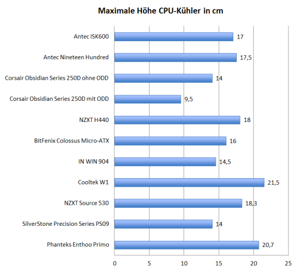 Der Prozessorkühler kann im ISK600 bis zu 17 cm in die Höhe ragen. Damit können selbst viele Towerkühler problemlos genutzt werden. Dieser Wert gilt allerdings nur, wenn der 3,5-Zoll-HDD-Träger aus dem Gehäuse entfernt wird. Mit Laufwerksträger bleiben noch etwa 14 cm (Festplatte oben montiert) bzw. 11 cm (Festplatte unter dem Träger montiert).