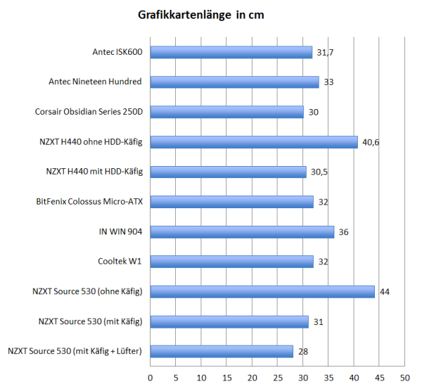 Knapp 32 cm reichen aus, um auch die meisten High-End-Grafikkarten unterbringen zu können. Es sollte aber bedacht werden, dass das Gehäuse maximal eine Dual-Slot-Grafikkarte aufnimmt. Exotische Triple-Slot-Modelle können hingegen nicht verbaut werden.
