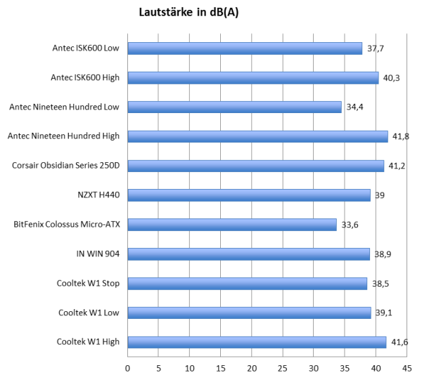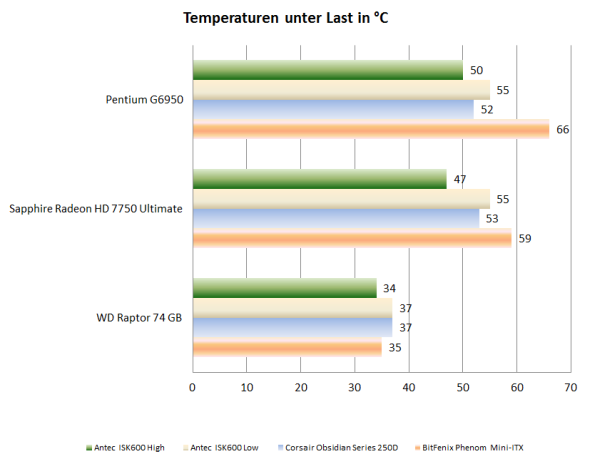 Die Messungen wurden jeweils bei niedriger und bei hoher Lüfterdrehzahl durchgeführt ("Low"- und "High"-Setting der Lüftersteuerung). Obwohl Antec das ISK600 nur mit einem 120-mm-Lüfter bestückt, bleiben die Temperaturen im grünen Bereich. Unabhängig von der Regelstufe bleiben Prozessor und Grafikkarte deutlich kühler als im BitFenix Phenom Mini-ITX. Bei maximaler Lüfterdrehzahl fallen die Temperaturen sogar etwas niedriger als im Corsair Obsidian Series 250D aus.