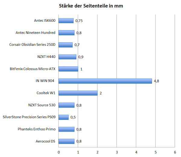 Für den Stahlteil des Gehäuses gibt Antec selbst eine Materialstärke von 0,8 mm an. Die Aluminiumseitenteile sind mit 0,75 mm hingegen geringfügig dünner.
