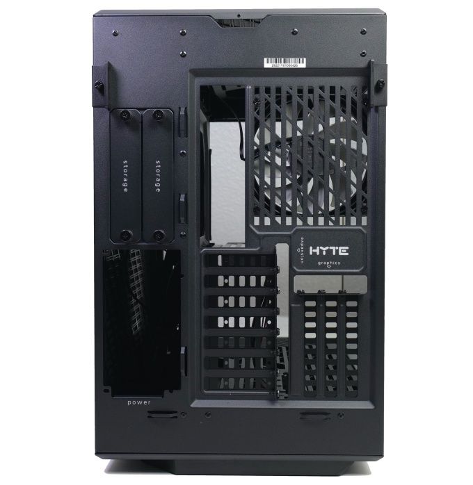 Das Y60 ist also klar auf die vertikale Grafikkartenmontage ausgelegt und bei der Nutzung weiterer Erweiterungskarten eingeschränkt. Neben den horizontalen Erweiterungskartenslots zeigt sich die vertikal orientierte ATX-Netzteilblende. Darüber sitzen zwei Laufwerkshalterungen, die nach dem Lösen von je zwei Rändelschrauben nach hinten herausgezogen werden. Rändelschrauben nutzt Hyte auch, um die beiden Seitenteile an der Rückwand zu sichern.