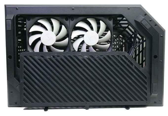 Das Stahlseitenteil auf der rechten Seite und der stählerne Gehäusedeckel unterscheiden sich optisch und auch funktional radikal von den Glasseiten. Hier prägen zahlreiche Luftschlitze das Bild. Dahinter sitzen jeweils Staubfilter, die fest mit Seitenteil bzw. Deckel verbunden sind.