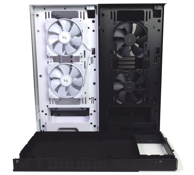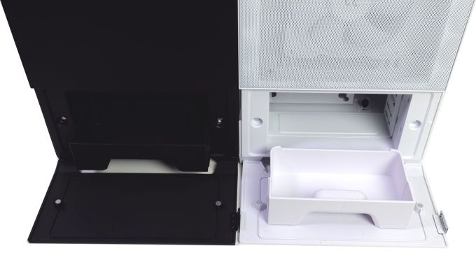 Dass die Fronten zweigeteilt sind, erklärt sich mit einer Besonderheit. Der unteren Teil der Gehäusefronten haftet magnetisch und kann einfach an der seitlichen Textil-Lasche (mit Fractal-Logo) abgezogen werden. Dahinter sitzt ab Werk eine Schublade, in der z.B. das Montagematerial verstaut werden kann. Zudem können an dieser Stelle zwei 5,25-Zoll-Laufwerke verbaut werden. Solche Laufwerksplätze sind mittlerweile zur Seltenheit geworden. Allerdings sitzen sie bei den Pop-Modellen in Bodennähe und erschweren so etwas die Nutzung der optischen Laufwerke (zumindest, solange das Gehäuse auf dem Fußboden steht).