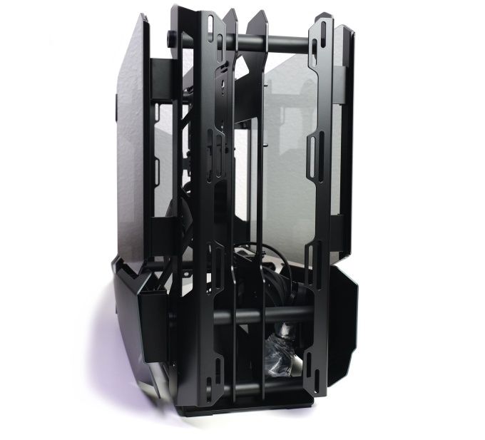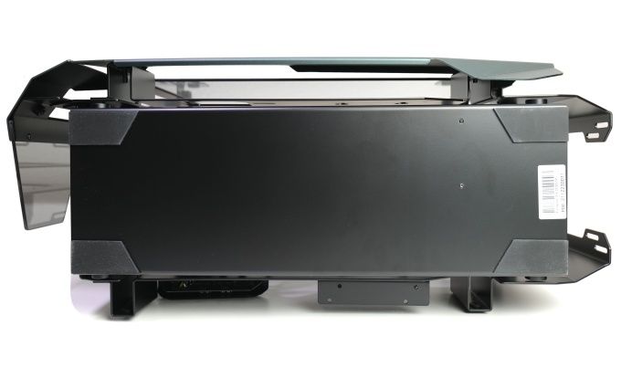 Die Glasseitenteile sind genau wie das Glas an der Front nur leicht getönt. Die Hardware ist dahinter entsprechend gut sichtbar. Anders als beim Torque werden die Glasseitenteile nicht mehr festgeschraubt, sondern werkzeuglos angeclipst. An der Innenseite verraten Beschriftungen, welches Seitenteil auf welcher Seite und mit welcher Ausrichtung montiert werden soll. Die Halterungen und seitlichen Streben für die Montage gehören zu den wenigen Bauteilen, die aus Stahl und nicht aus Aluminium gefertigt werden. Die Aluminiumelemente unter den Glasseitenteilen sind angesteckt. Sie können ebenfalls einfach abgenommen werden.