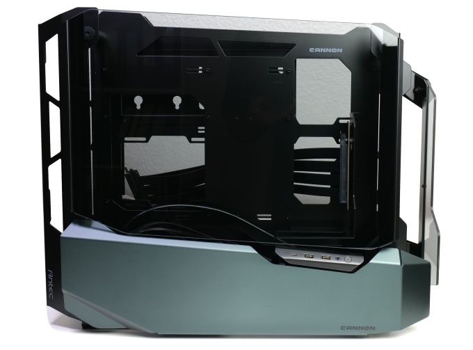 An der Rückseite zeigt sich eine Blende für drei 120- oder 140-mm-Lüfter bzw. einen 360- oder 420 mm-Radiator. Diese Blende wird möglich, weil das Mainboard im Cannon um 90 Grad gedreht montiert wird. Seine I/O-Blende zeigt deshalb nicht nach hinten, sondern nach unten.