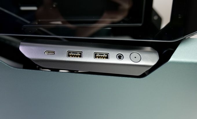 Zwischen Glas und dem Aluminiumelement sitzt auf der linken Gehäuseseite das I/O-Panel mit Powertaste, Audiobuchse, zwei USB-3.0-Ports und einem USB-Typ-C-Anschluss.