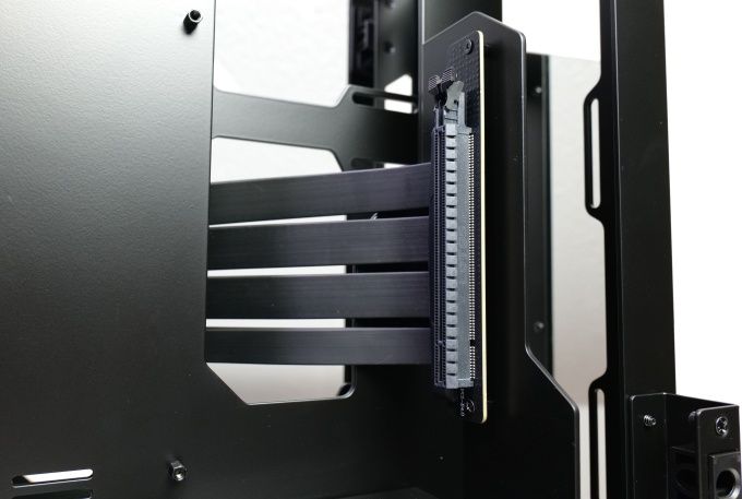 Ab Werk ist ein PCIe-4.0-Riserkabel im Cannon montiert. Damit kann die Grafikkarte vom Mainboard getrennt montiert werden. In der Standardposition findet sie aufrecht neben dem Mainboard Platz. Alternativ kann man sie aber auch direkt an der Front montieren, gibt damit aber die Frontlüfterplätze/den Frontradiatorplatz auf.