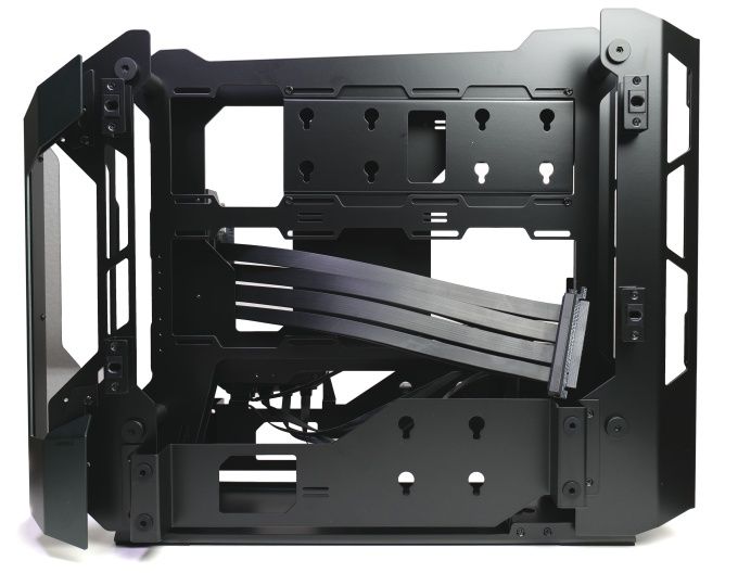 Das Mainboard wird im Cannon zwar wie in den meisten Gehäusen auf der linken Seite des Mainboardträgers montiert, wie angesprochen orientiert man die I/O-Blende dabei aber nach unten. Hinter der leicht bläulich schimmernden Aluminiumblende verbirgt sich ein einzelner 2,5-Zoll-Laufwerksträger. In ihm können zwei 2,5-Zoll-Laufwerke übereinander montiert werden. Der Träger wird einfach mit Gummielementen werkzeuglos an seinen Platz geschoben. Er kann an verschiedenen Positionen montiert werden.