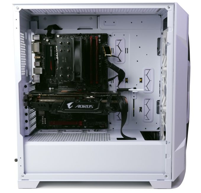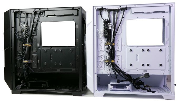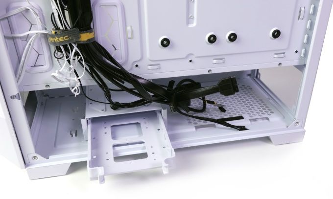 Auch hinter dem Mainboardtray sind DP503 und DP505 White identisch aufgebaut. Antec bündelt die Gehäusekabel ab Werk mit zwei Klettverschlüssen. Das ist auch deshalb praktisch, weil allein schon die drei A-RGB-Lüfter für einiges Kabelaufkommen sorgen. Am Mainboardtray können zwei 2,5-Zoll-Laufwerke montiert werden. Antec nutzt dafür eine Montagelösung, die wir so ähnlich bisher vor allem von Cooler Master kennen. Kleine Metall-Pins können von Hand in die Laufwerke geschraubt werden. Anschließend werden sie einfach in die Gummiringe am Mainboardträger gedrückt. So wird eine werkzeuglose und entkoppelte Montage ermöglicht.