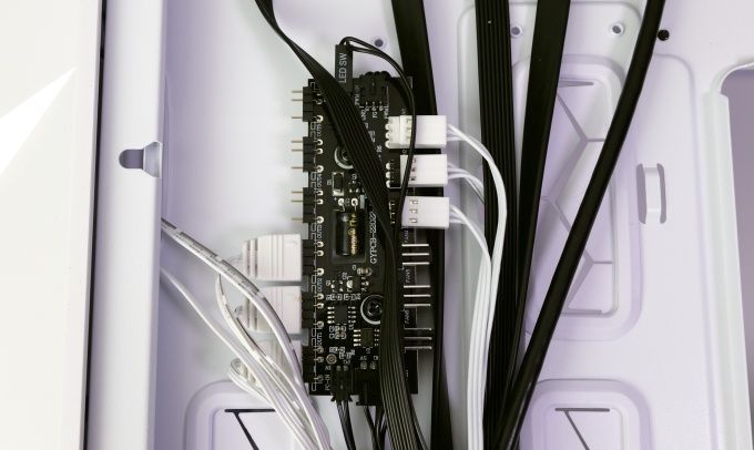 Der Controller erlaubt eine Steuerung von bis zu sechs A-RGB-Elementen wahlweise über die LED-Taste im Deckel oder über ein Mainboard mit dem üblichen 5-V-A-RGB-Anschluss. Zudem dient er als Hub für bis zu sechs 3-Pin-Lüfter, die zusammen über ein PWM-Signal gesteuert werden können. Dabei haben wir am Testsystem auch eine Drehzahl angezeigt bekommen. Die Maximaldrehzahl der Lüfter liegt demnach bei etwa 1.050 U/min, die Minimaldrehzahl bei etwa 600 U/min.