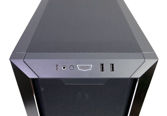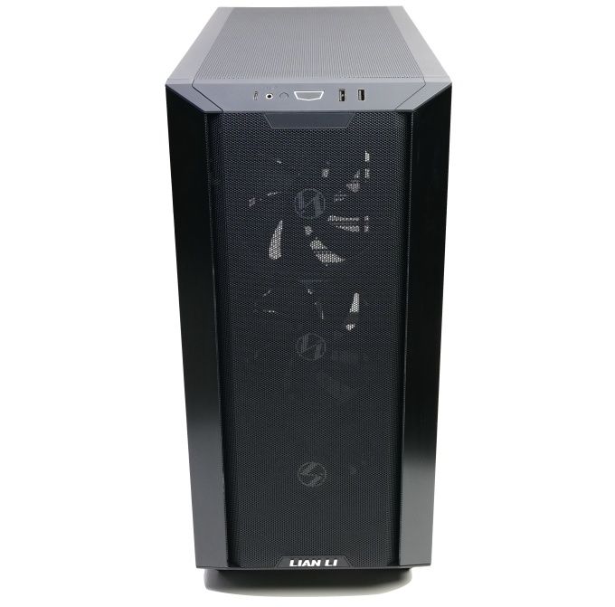 Das I/O-Panel wurde in die angeschrägte Oberkante der Front integriert. Es stellt zwei USB-3.0-Ports, einmal USB-C und eine kombinierte Kopfhörer-/Mikrofonbuchse bereit. Im Zentrum sitzt die Power-Taste. Deutlich kleiner und unauffälliger ist die Resettaste daneben. Das I/O-Panel kann alternativ auch in Bodennähe montiert werden. Dann wird zusätzlich die Meshfront gedreht und die Plakette mit dem Lian-Li-Schriftzug nach oben versetzt.